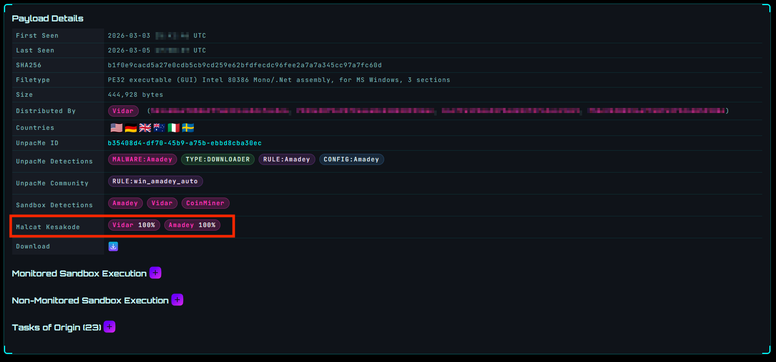To increase the detection capabilities of downloaded payloads, LIA has partnered with Malcat to implement Kesakode in the payload analysis pipeline.